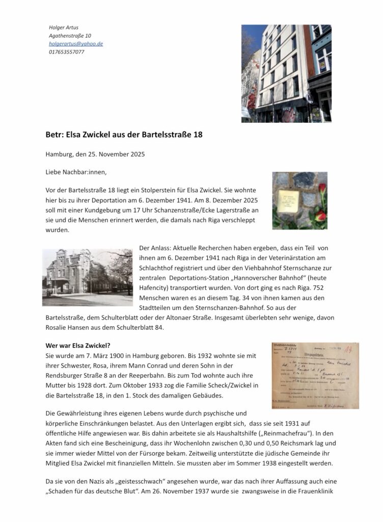 Vor der Bartelsstraße 18 liegt ein Stolperstein für Elsa Zwickel. Sie wohnte hier bis zu ihrer Deportation am 6. Dezember 1941. Am 8. Dezember 2025 soll mit einer Kundgebung um 17 Uhr Schanzenstraße/Ecke Lagerstraße an sie und die Menschen erinnert werden, die damals nach Riga verschleppt wurden.