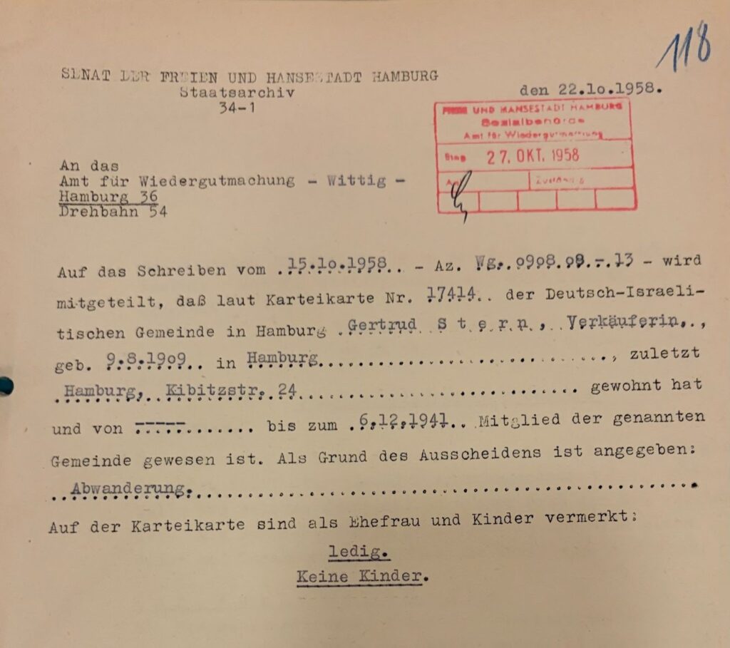 Bereits am 4. Dezember 1941 war die Gestapo in ihrer Wohnung gewesen und hatte Wertgegenstände geraubt. „Nach der Deportation … kam die Gestapo nochmals, um das Zimmer zu durchsuchen. Sie beschlagnahmte die Schreibmaschine und nahm sie mit“, berichtete Hannah Bonnier, die mit ihrem Mann zur Untermiete bei den Sterns wohnte. Der damalige Hausmeister verhinderte, dass auch ihre Heizkohle mitgenommen wurde.