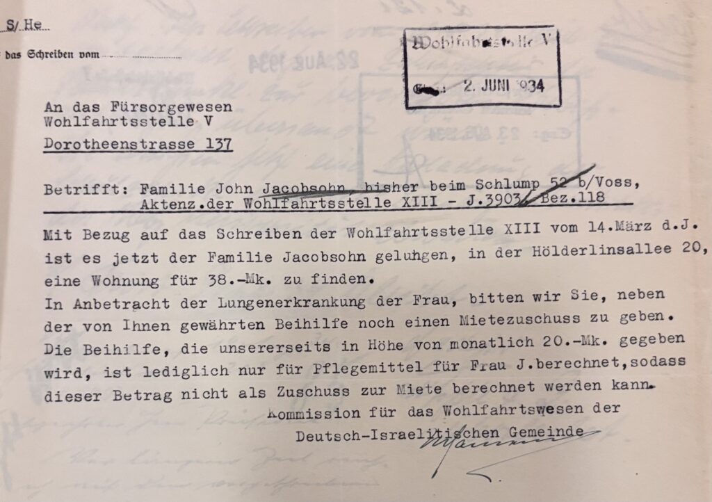 Die angespannte finanzielle Lage und Rosas Krankheit prägten die Wohnverhältnisse des Ehepaars. Bis zum 1. Mai 1934 waren sie in Hamburg bereits sechsmal umgezogen, jeweils nur in einem möblierten Zimmer. Erst durch die Unterstützung der Jüdischen Wohlfahrt konnten sie in eine 2-Zimmer-Wohnung in der Hölderlinsallee 20 ziehen. „Frau Jacobsohn ist lungenleidend und muss eine gesunde Wohnung haben“, schrieb das Wohlfahrtswesen der jüdischen Gemeinde. „Wir geben der Familie J. monatlich 20 RM, da wir in Anbetracht der leidenden Frau eine Heizungswohnung für angebracht hielten.“ Außerdem sei Frau J. „außerordentlich pflegebedürftig.“  John Jacobsohn fand als Jude keine reguläre Arbeit mehr. Ab dem 23. November 1937 wurde er durch die staatliche NS-„Fürsorge“ als Zwangsarbeiter in Waltershof/Köhlbrand eingesetzt.